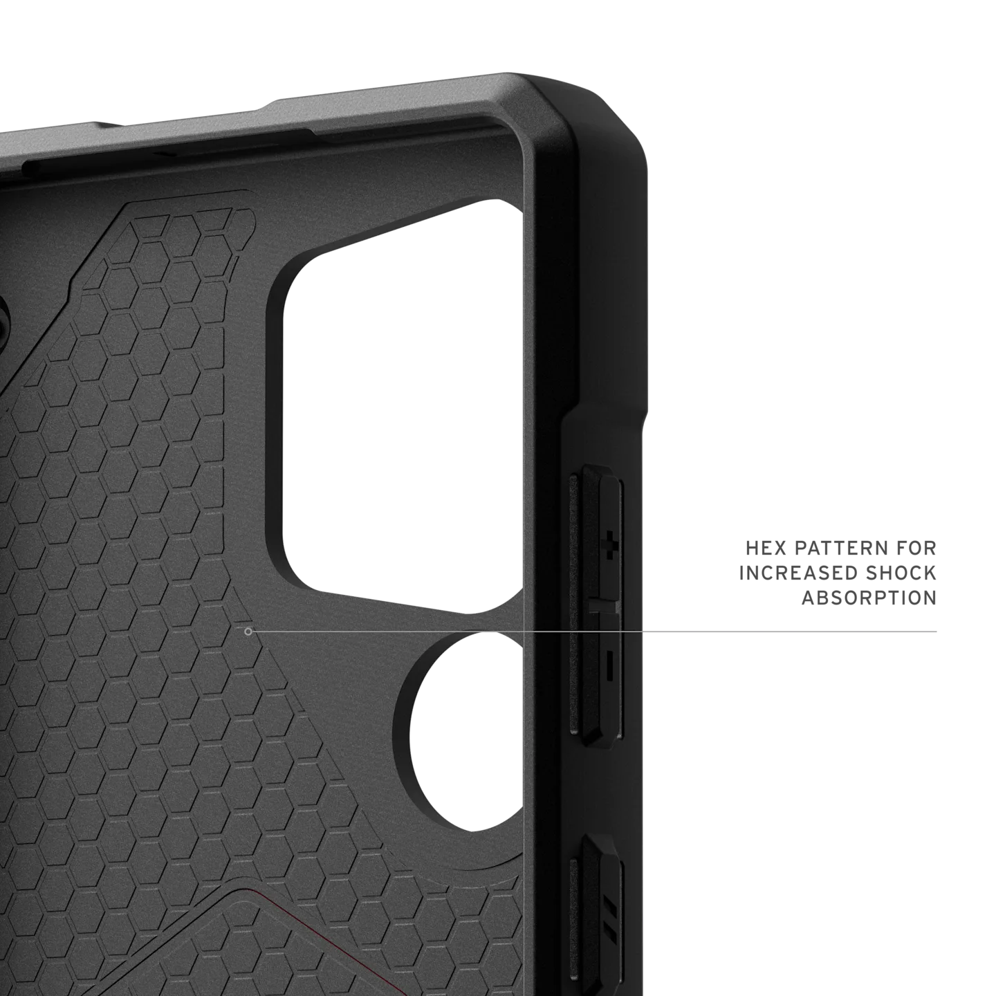 - ภายในเคสออกแบบให้มีลายหกเหลี่ยม หรือ Hex Pattern เพื่อช่วยดูดซับแรงกระแทก ทำให้เครื่องของคุณปลอดภัยในทุกสถานการณ์